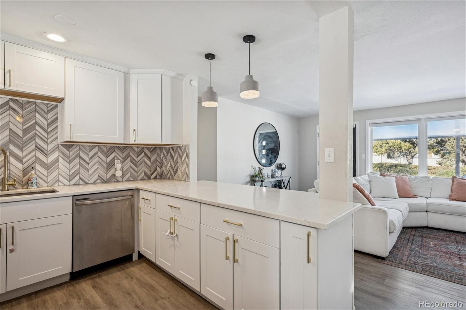 The main level features an open and bright kitchen with new cabinetry, quartz countertops, stainless steel appliances, herringbone tile backsplash, brass hardware, and statement pendant lighting --perfect for cooking, hosting, and day-to-day living. Two beautifully updated bathrooms showcase contemporary tilework, gold-tone plumbing fixtures, rainfall shower heads, and polished lighting for a spa-like experience.